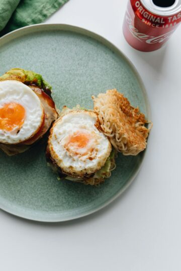 Ramen-Burger Zutaten für 2 Burger: 2 Portionen Ramen-Nudeln (trocken) 2 Eier Öl zum Braten 2 Burger-Patties (Rind, Hähnchen oder vegetarisch) Salatblätter Tomatenscheiben Gurkenscheiben Burger-Sauce nach Wahl (z. B. Mayo, Sriracha-Mayo) Salz und Pfeffer Zubereitung: Die Ramen-Nudeln nach Packungsanleitung kochen, aber ohne Gewürzpaket. Gut abtropfen lassen und mit einem Ei vermischen, sodass die Nudeln zusammenhalten. Aus der Nudelmasse zwei flache „Brötchen“ formen, am besten mit Hilfe eines Rings oder einer Schüssel, die Größe sollte etwa der eines Burgerbrötchens entsprechen. Öl in einer Pfanne erhitzen und die Nudelbrötchen darin bei mittlerer Hitze goldbraun und knusprig braten, dabei vorsichtig wenden. Währenddessen die Burger-Patties würzen und in einer anderen Pfanne oder auf dem Grill braten, bis sie gar sind. Sobald alles fertig ist, die Nudelbrötchen mit Salat, Tomaten, Gurken, Burger-Pattie und Sauce schichten. Deckel drauf und servieren.