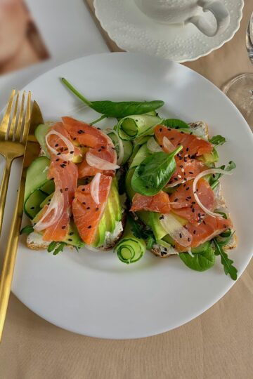 Rührei mit Räucherlachs und Avocado (für 2 Personen) Zutaten: 4 Eier 1 Schuss Milch Salz und Pfeffer 1 kleine Avocado 100 g Räucherlachs Etwas Butter oder Öl zum Braten Optional: frische Kräuter (z. B. Schnittlauch oder Dill) Zubereitung: Die Eier mit einem Schuss Milch in einer Schüssel verquirlen und mit Salz und Pfeffer würzen. Die Butter oder das Öl in einer Pfanne erhitzen. Die Eiermasse hineingeben und bei mittlerer Hitze langsam stocken lassen, dabei regelmäßig sanft umrühren, bis ein cremiges Rührei entsteht. Währenddessen die Avocado halbieren, den Kern entfernen, das Fruchtfleisch herauslösen und in Scheiben schneiden. Den Räucherlachs in mundgerechte Stücke zupfen. Das fertige Rührei auf Tellern anrichten, mit Avocado und Räucherlachs garnieren und nach Wunsch mit frischen Kräutern bestreuen. Guten Appetit! Wenn du magst, kann ich dir auch eine Variante mit Vollkornbrot oder Joghurt empfehlen.