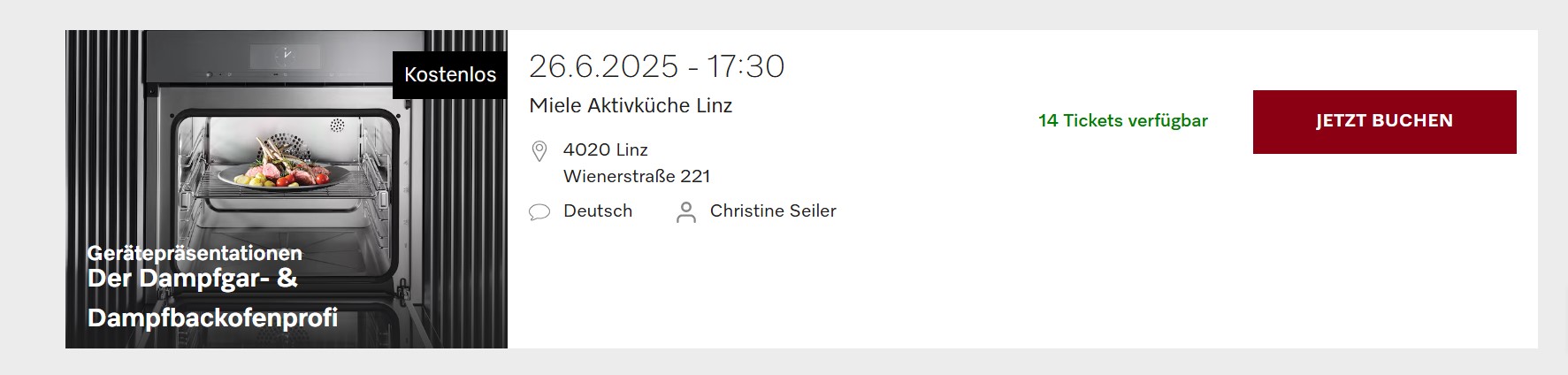 Bei dieser Veranstaltung entdecken Sie die Vorteile und Unterschiede des Dampfgarers und Dampfbackofens. Besuchen Sie uns und nutzen Sie die Möglichkeit Miele Geräte in Aktion zu erleben, wertvolle Tipps zu erhalten, wie Sie diese optimal nutzen können, sowie Ihre individuellen Fragen zu stellen.